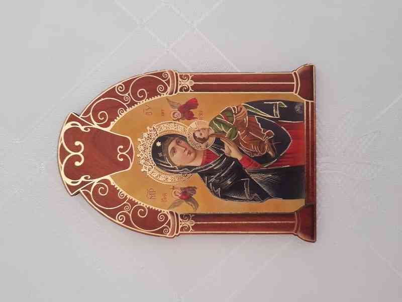 Prodám krásnou malovanou na dřevě ikonku Matky Boží Ustavičné pomoci. Vpravo archanděl Gabriel nese kříž a hřeby, vlevo archanděl Michael nese nádobu s kopím a houbou. Rozměry: 7,5 x 11 x 0,5 cm.