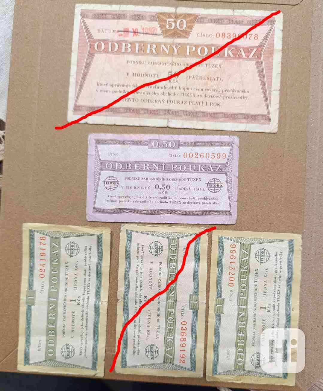 Prodám staré Tuzexové poukázky - BONY: Odběrný poukaz na 50 Kčs, platnost prodloužena razítkem na reversu poukázky od 10.05.1988 na dobu jednoho roku, obdélníkové razítko TUZEX (PRODÁNO). Odběrní poukaz v hodnotě 0,50 Kčs, I/1989, stav dle foto, cena 250,- Kč. Dva kusy Odběrních poukazů v hodnotě 1,0 Kčs, II/1990 (tento PRODÁN), cena za kus 150,- Kč. Osobní předání na Praze 3, nebo odeslání přes Zásilkovnu, či Balíkovnu. Volejte 770 630 523, nebo pište na morgiana007@gmail.com