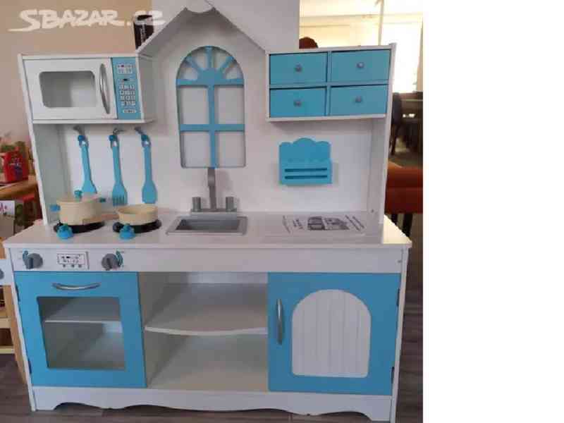 Kuchyňka je vyrobena z 10mm silné MDF v bílé a modré barvě. ROZMĚRY KUCHYNĚ: 105 x 30 x 108 cm (šířka / hloubka / výška), délka desky stolu: 100 cm 49 cm , horní výška: 49 cm, dřez: 21,5 x 16 cm. Rozměry balení: 107,5 x 65,5 x 16,5 cm (d / š / v). Hmotnost: 25 kg