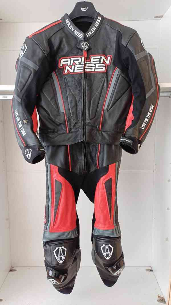 Kožená skvěle padnoucí 2 – dílná kombinéza od americké značky Arlen Ness ve velikosti – 54. Je použitá, ale celkově ve velmi dobrém stavu. Lze jednoduše rozdělit na bundu a kalhoty zipem v pase.