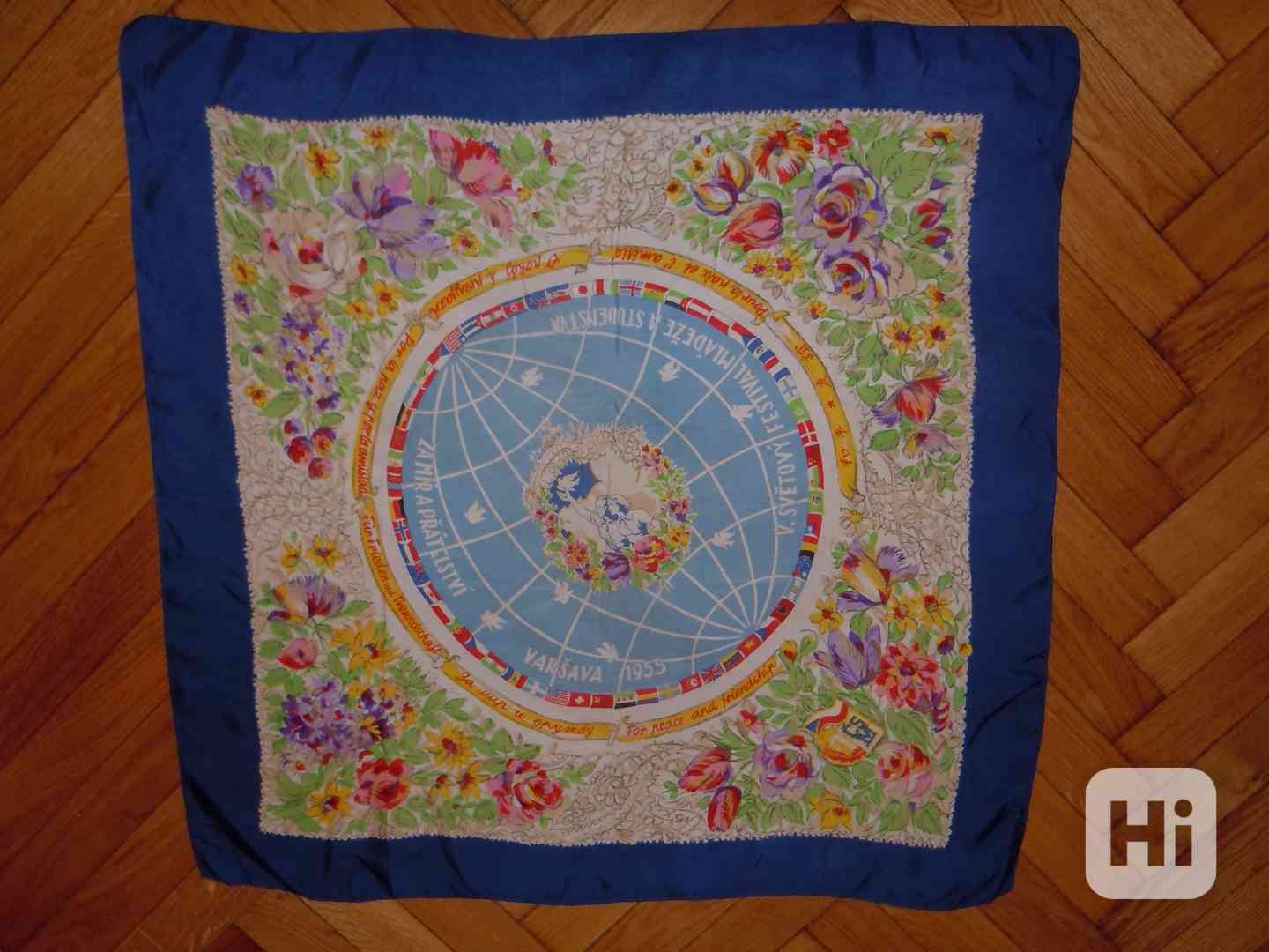 Prodám krásný hedvábný šátek věnovaný 5. světovému festivalu mládeže a studentů ve Waršawě, rok 1955. Rozměry: 73 x 73 cm, perfektní stav. Pro sběratele. Osobní předání na Praze 3, nebo zaslání přes Zásilkovnu. Volejte 770 630 523, nebo pište na morgiana007@gmail.com