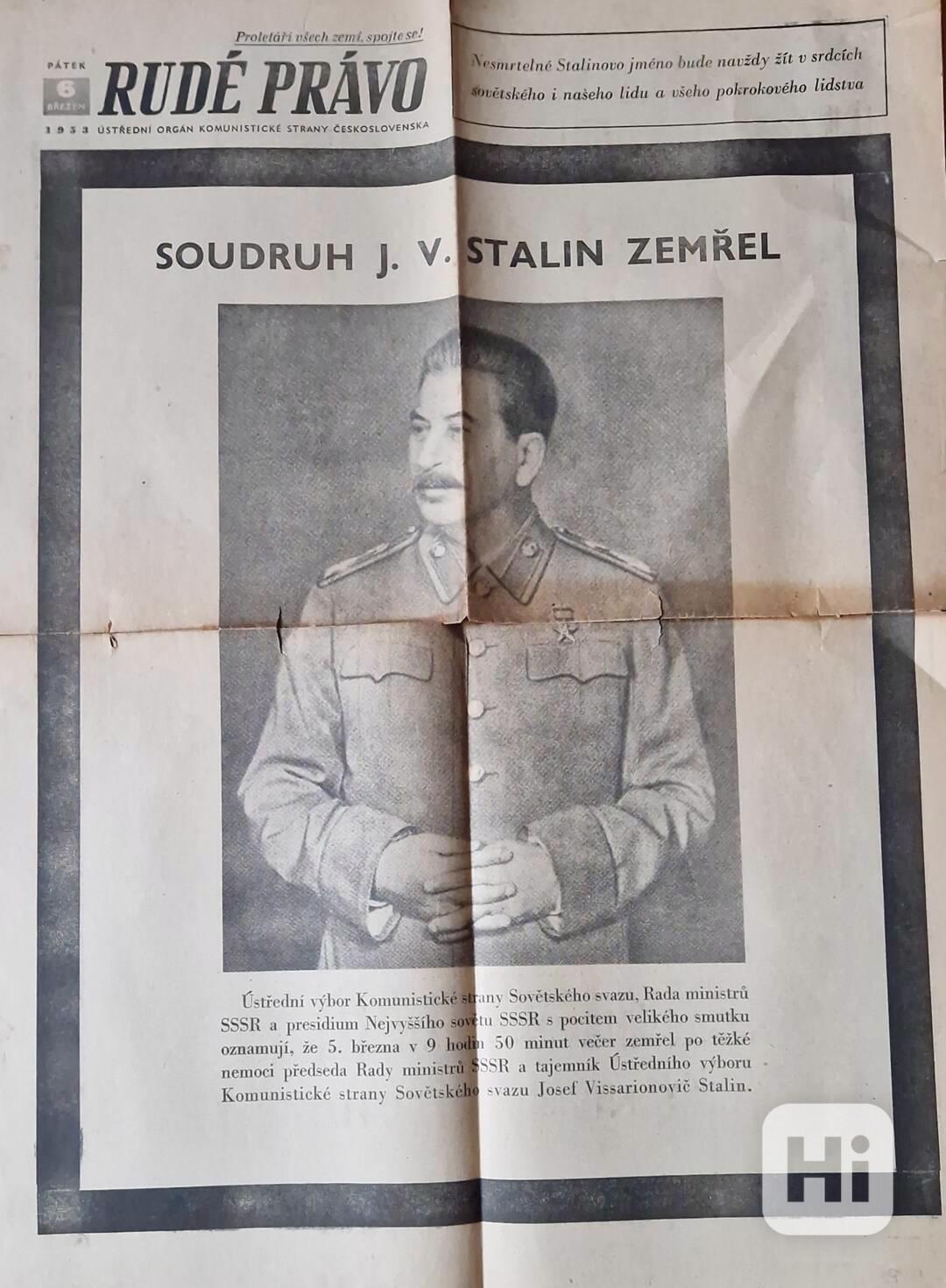 Další noviny jsou Rudé právo s titulem - Pevně a k novým vítezstvím poneseme prapor soudruha Gottwalda.Noviny pojednávající o smrti Gottwalda a jeho pohřbu.Jsou z 16.března 1953.Málo vídaný a hodně ceněný výtisk,pro sběratele starých tisků a novin.