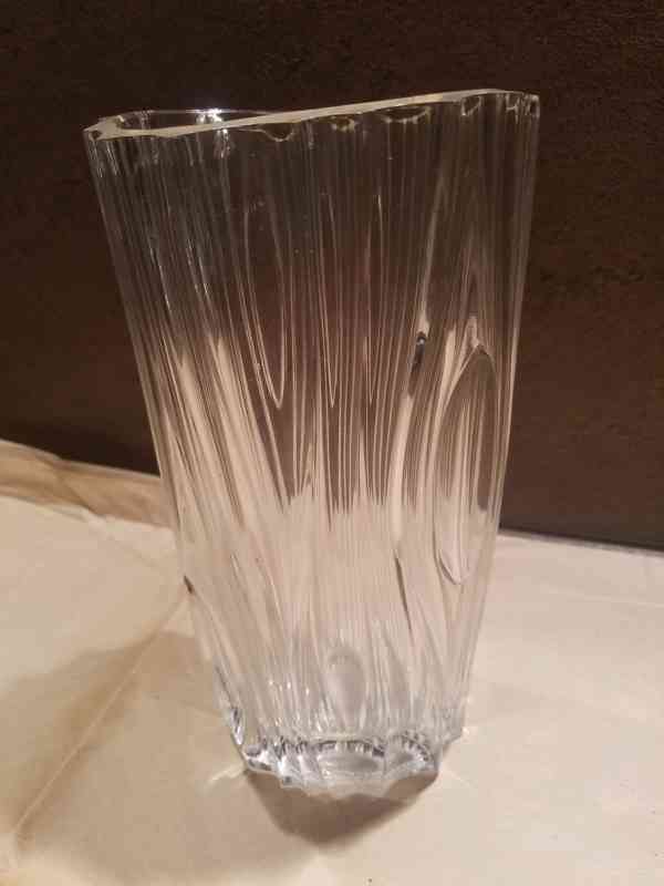 Prodám vázu z čirého hutního skla dle návrhu Jiřího Řepáska, bohužel na horní hraně je oťuk (viz foto) - zohledněno v ceně. Výška 20 cm. Osobní předání na Praze 3, nebo, pečlivě zabaleno, odeslání přes Zásilkovnu. Volejte 770 630 523, nebo pište na morgiana007@gmail.com