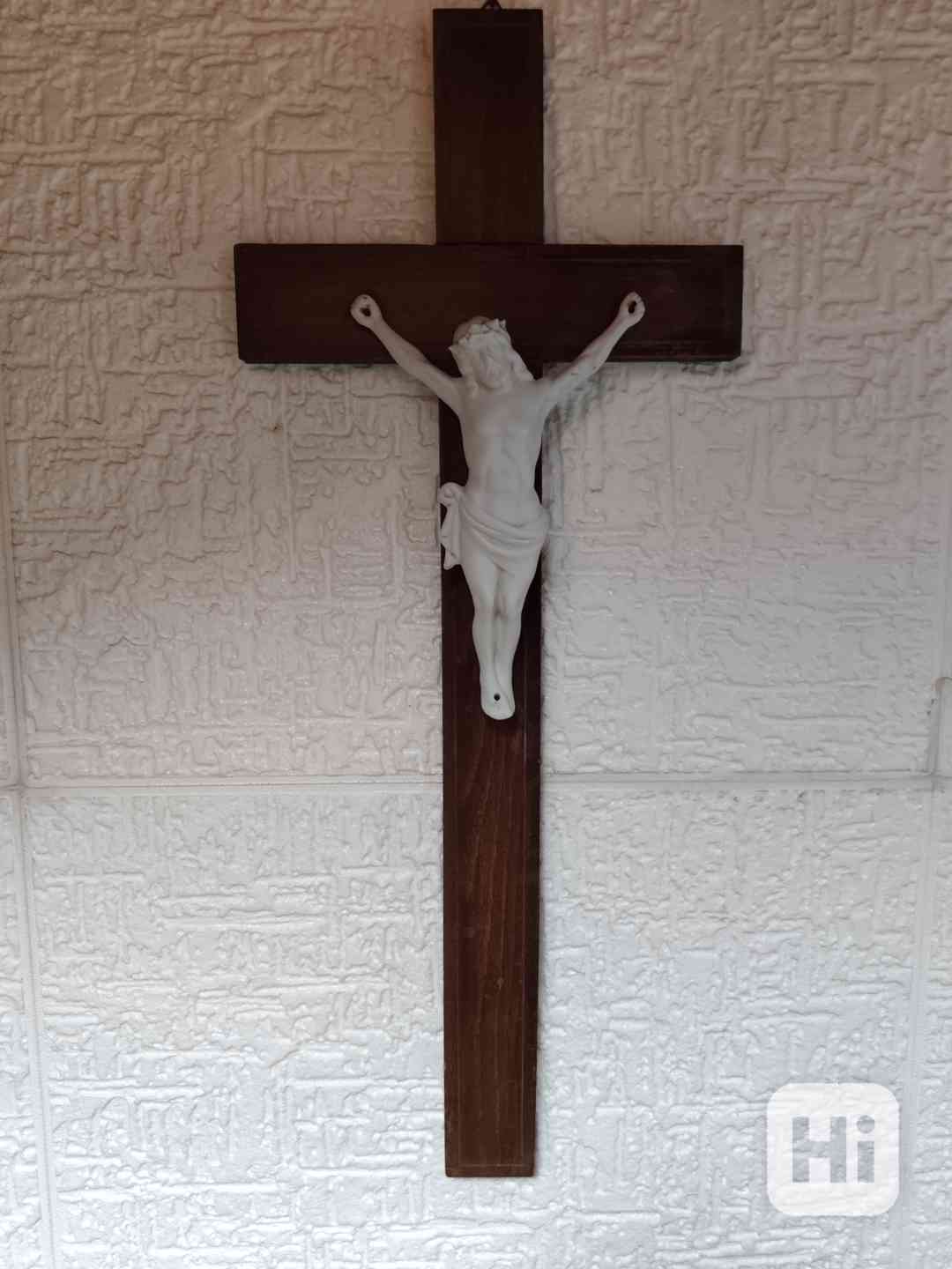 Prodám starodávný dřevěný kříž s porcelánovým Ježíšem po babičce. Míry 60x25.