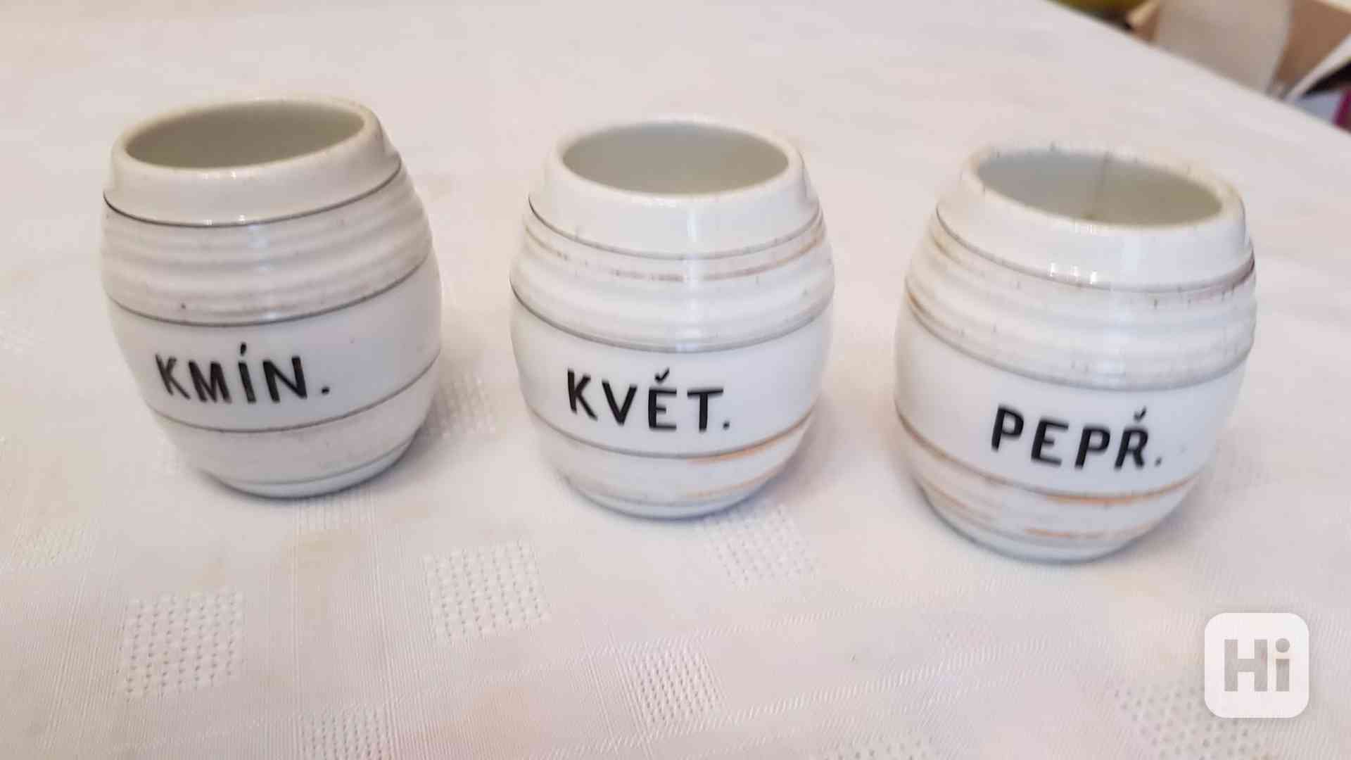 Prodám sadu tří porcelánových kořenek s víčkem soudkového tvaru a nápisy - kmín, květ, pepř, a zlacením po obvodu, výška 8,5 cm. Jedno víčko poškozeno - zohledněno v ceně. Krásná dekorace na chalupu, ale i použitelné v kuchyni. Osobní předání na Praze 3, nebo zaslání přes Zásilkovnu. Volejte 770 630 523, nebo pište na morgiana007@gmail.com