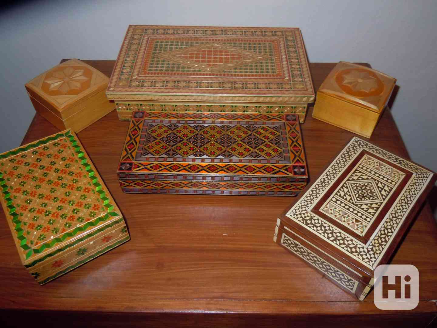 Prodám staré dřevěné kazety (krabičky) - šperkovnice, intarzované slámou, kostí a perletí, uvnitř některé potažené sametem - viz foto. Zcela nové, nepoškozené v perfektním stavu. Zadní řada: největší 25 x 16 cm – 180,-Kč (PRODÁNO), 2 nejmenší po stranách 8 x 8 cm - 80,-Kč/ks. Přední řada: zelená (vlevo - PRODÁNO), červená (uprostřed - PRODÁNO), vpravo kazeta vykládaná kostí a perletí (dovoz z Egypta 60-tá léta - PRODÁNO). V případě zájmu specifikujte, o kterou máte zájem. Osobní předání na Praze 3, nebo zaslání přes Zásilkovnu. Volejte 770 630 523, nebo pište na morgiana007@gmail.com