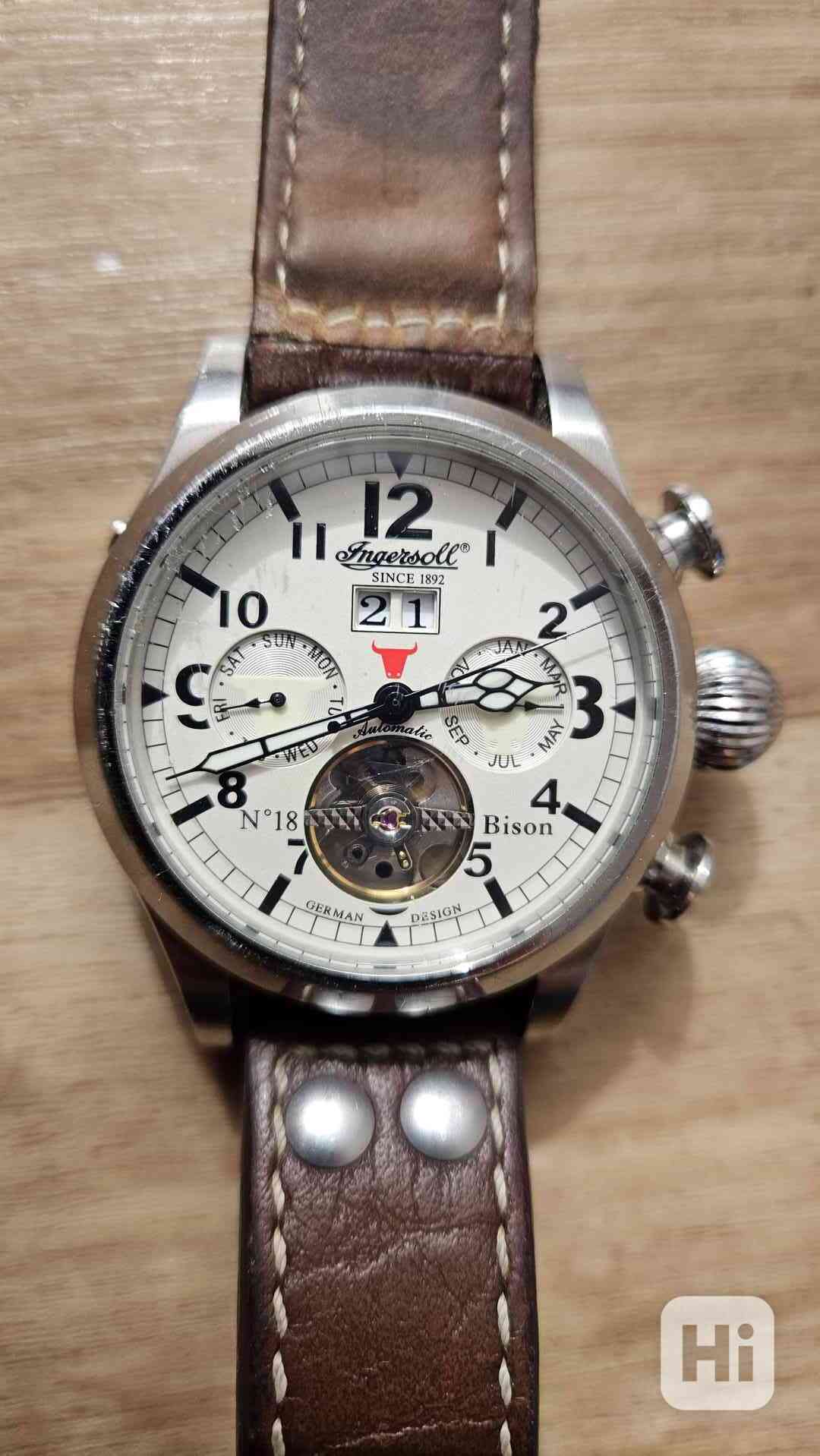 Pánské automatické hodinky značky Ingersoll z řady Bison No. 18 má průměr 45 mm.Pouzdro hodinek je vyrobeno z nerezové oceli, řemínek hodinek, který má přezku, je vyroben z teletiny a sklíčko hodinek je vyrobeno z tvrzeného minerálního skla Hodinky jsou vodotěsné do tlaku 5 ATM. Hodinky disponují těmito funkcemi: sekundy, minuty, hodiny, datum, měsíc, den v týdnu ,zachovalé jdoucí přesně.