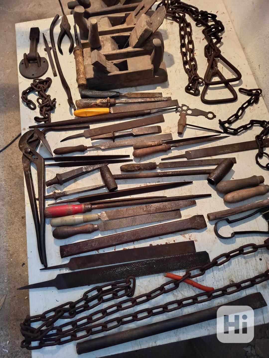 soubor dílenského nářadí, pilníky, hoblíky, kleště, majzliky, řetězy