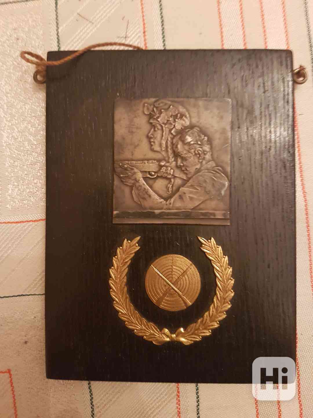 Prodám bronzovou plaketu střelce z pušky a ženy v helmě, zdobené lipovými listy na dřevěné podložce. Ve spodní části dřevěné podložky je umístěn terč se zkříženými puškami, který je z obou spodních stran lemován vavřínovými listy, uprostřed svázanými stuhou. Celkové rozměry podložky: 12,5 x 17. Rozměry plakety: 6 x 6,5 cm. Osobní předání na Praze 3, nebo zaslání přes Zásilkovnu, či Balíkovnu. Volejte 770 630 523, nebo pište na morgiana007@gmail.com