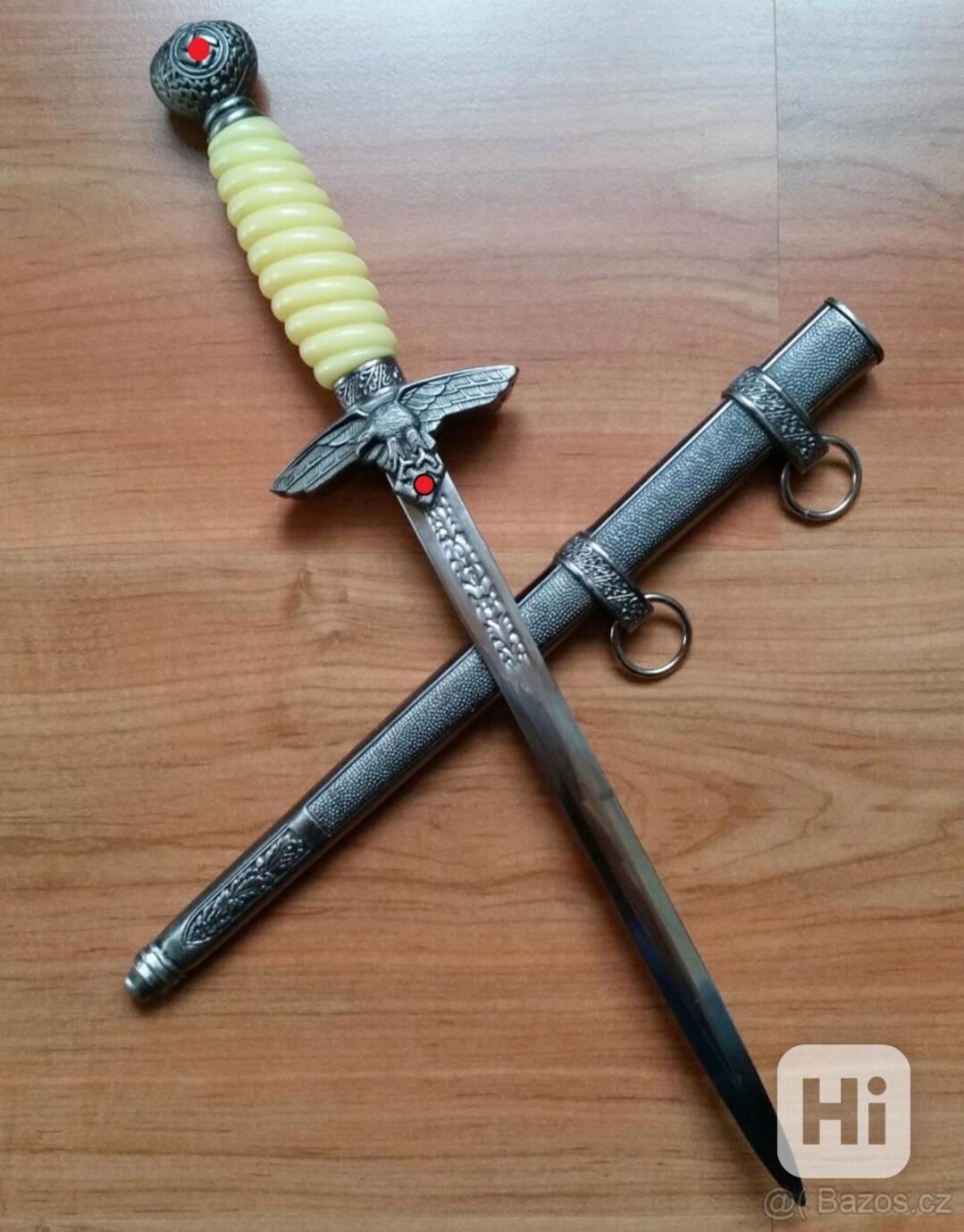 Prodám sběratelům válečných věcí tuto repliku německého kordíku pro důstojíky letectva (Luftwaffe) od roku 1937,je i s pouzdrem.Při dneštních cenách originálních kousků,je tato cenově dostupná varianta rozumným řešením a dýka určitě ve sbírce neudělá ostudu a je moc pěkná ve vitrýnce.Rozměry d = 38 cm, čepel 24 cm.Stav je jako nový.Výrobce už ho přestal vyrábět,tudíž jedinečná možnost ho ještě zakoupit.Třeba se někomu hodí do sbírky.