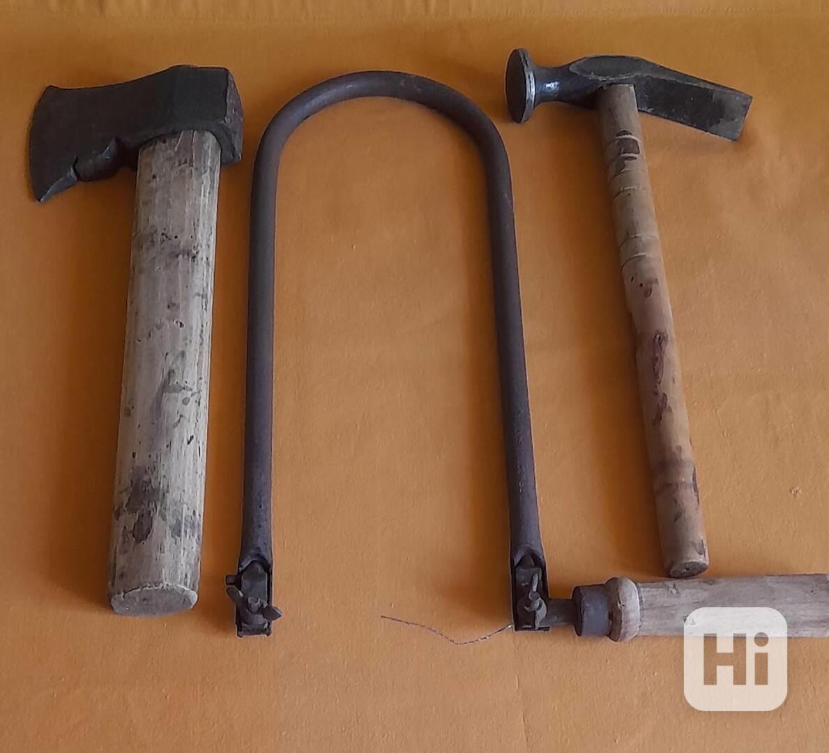 Retro sada venkov ( kosa, naklepávací stolička, pila)