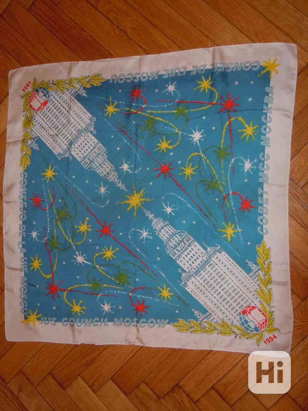 Prodám starší hedvábný šátek z jednání Mezinárodního svazu studentů v Moskvě v roce 1954. Rozměry: 78 x 78 cm. Perfektní stav. Sběratelský kousek. Osobní předání na Praze 3, nebo zaslání přes Zásilkovnu či Balíkovnu. Volejte 770 630 523, nebo pište na morgiana007@gmail.com