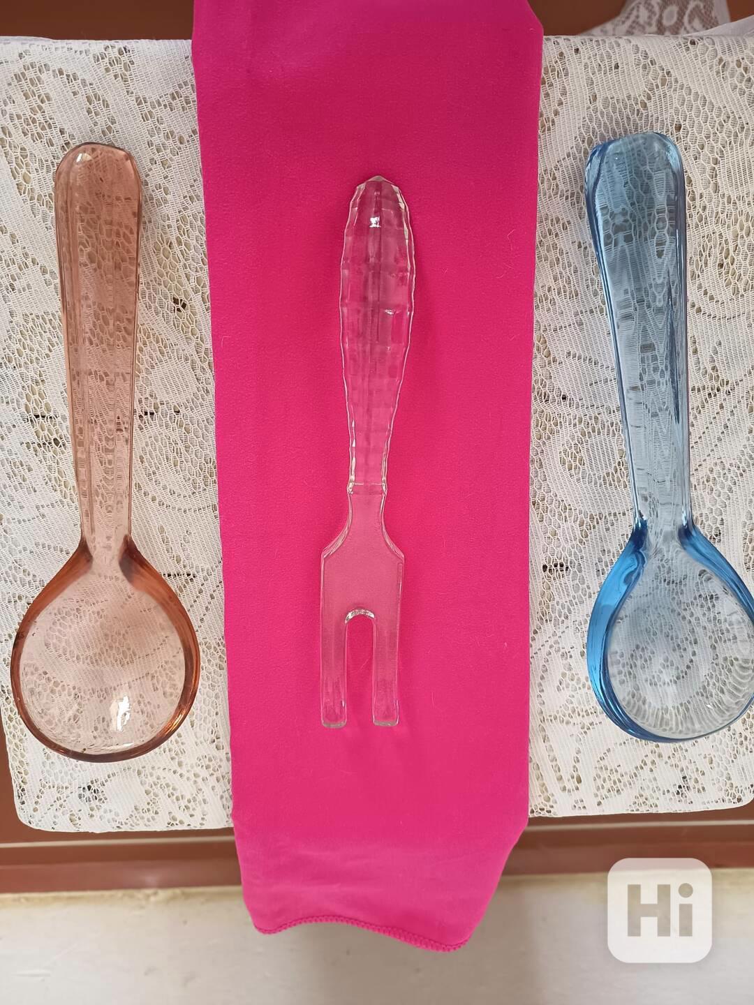 Prodám krásné skleněné barevné robustní salátové lžíce - 2 ks a jednu vidličku, délka 23 cm