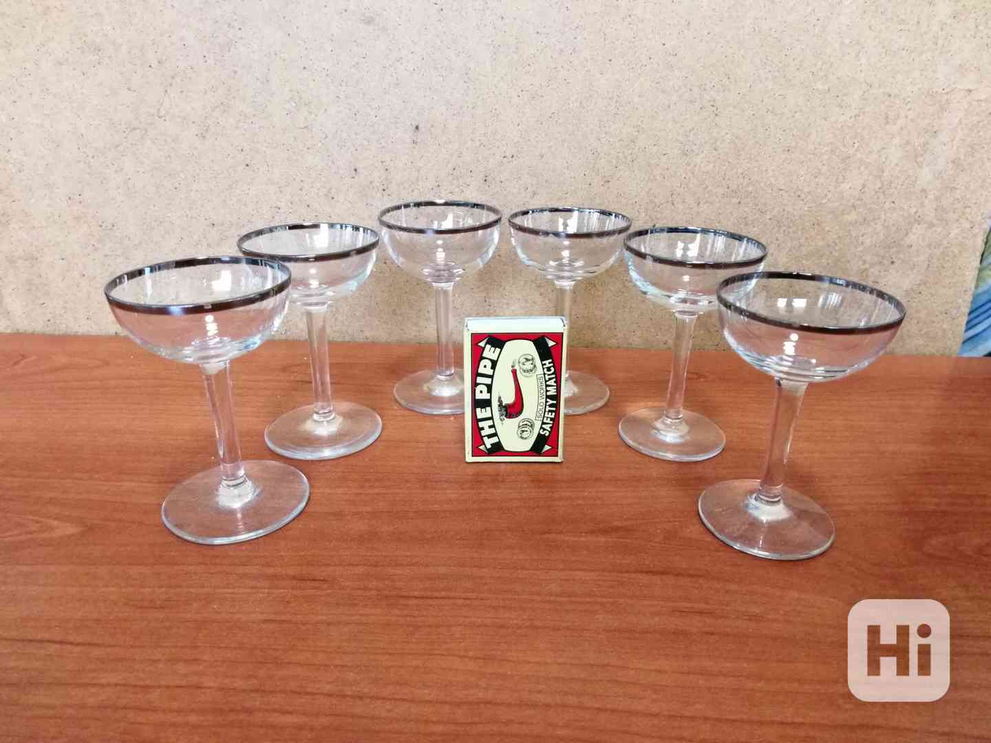 Prodám 6 kusů likérových skleniček se stříbrným proužkem, výška 77 mm, průměr 50 mm, objem cca 2cl. Perfektní stav. Bližší specifikace není. Cena 200,- Kč.