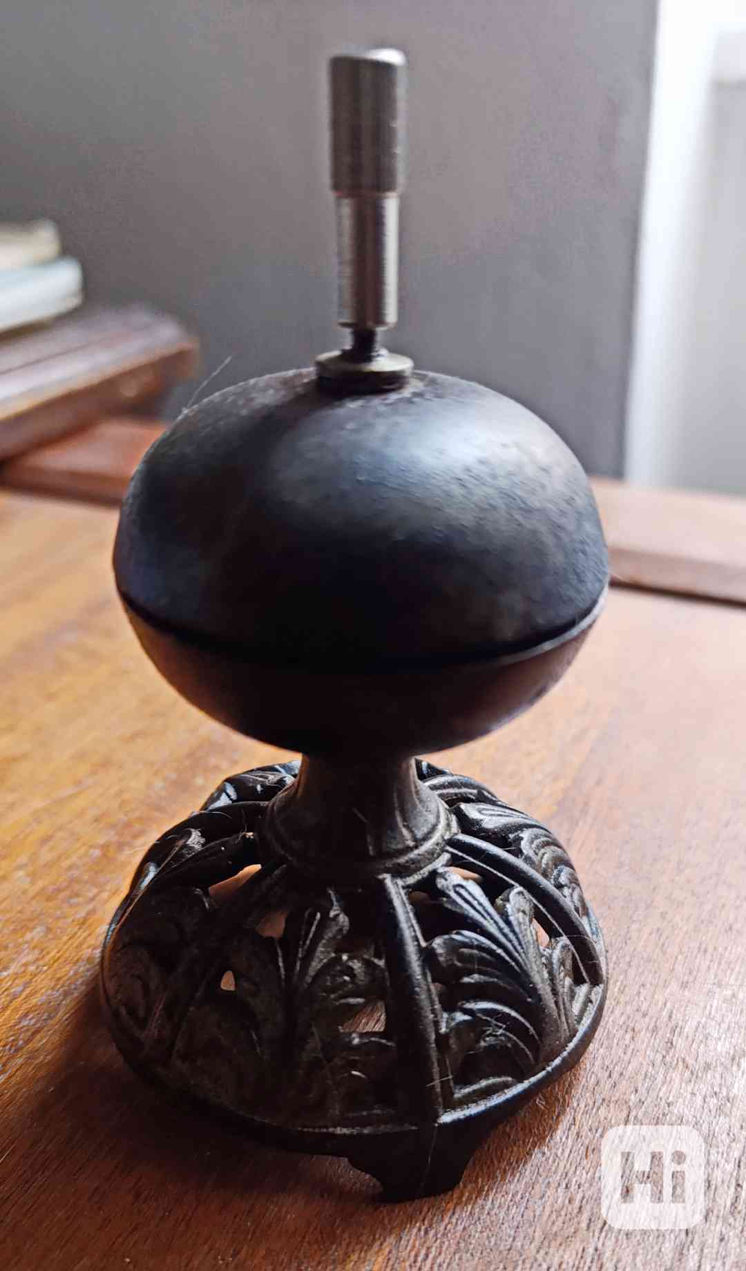 Prodám starožitný zdobený hotelový recepční zvonek, původní kus, který býval pochromovaný, doposud nerestaurovaný, avšak stále funkční. Zvuk vzniká otáčením sem a tam horního trnu nad zvonkem. Materiál litina, mosaz. Rozměry: výška 10 cm, šířka základny - 7 cm. Rarita! Osobní předání na Praze 3, nebo odeslání přes Balíkovnu či Zásilkovnu. Volejte 770 630 523, nebo pište na morgiana007@gmail.com
