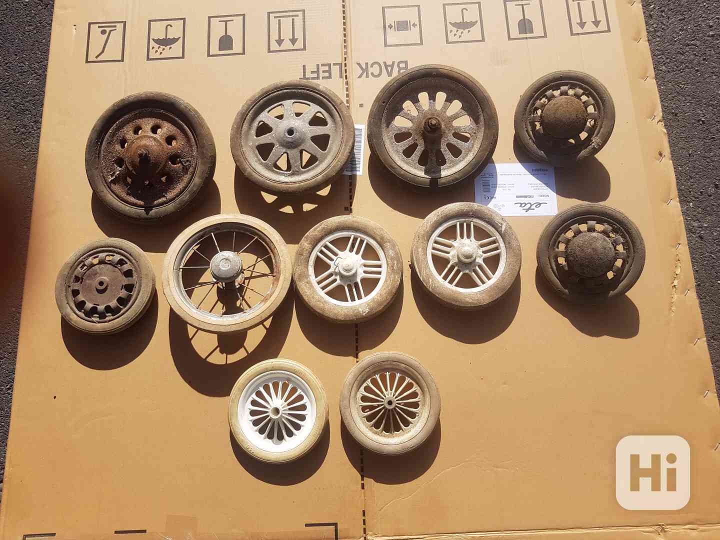 Prodám starožitná kovová a mladší plastová kolečka s gumou k retro dětským kočárkům. Rozměry dle čísel fotografií: č. 1) 2 kusy, průměr 18,5 - 19,0. č. 2) 1 ks bílé, průměr 22 cm. č. 3) 2 kusy, průměr 16 cm. č. 4) 4 kusy - žluté a červené, průměr 11,5 - 12,0. č. 5) 3 ks, průměr 18 cm. č.6) 2 ks různé, průměr obou 23 cm. č. 7) 1 ks, průměr 24 cm. Stav dle foto, i jednotlivě. Kovová kolečka cena za kus 80,- Kč, plastová cena za kus 25,- Kč. Možnost osobního předání na Praze 3, nebo odeslání přes Zásilkovnu. Volejte 770 630 523, nebo pište na morgiana007@gmail.com