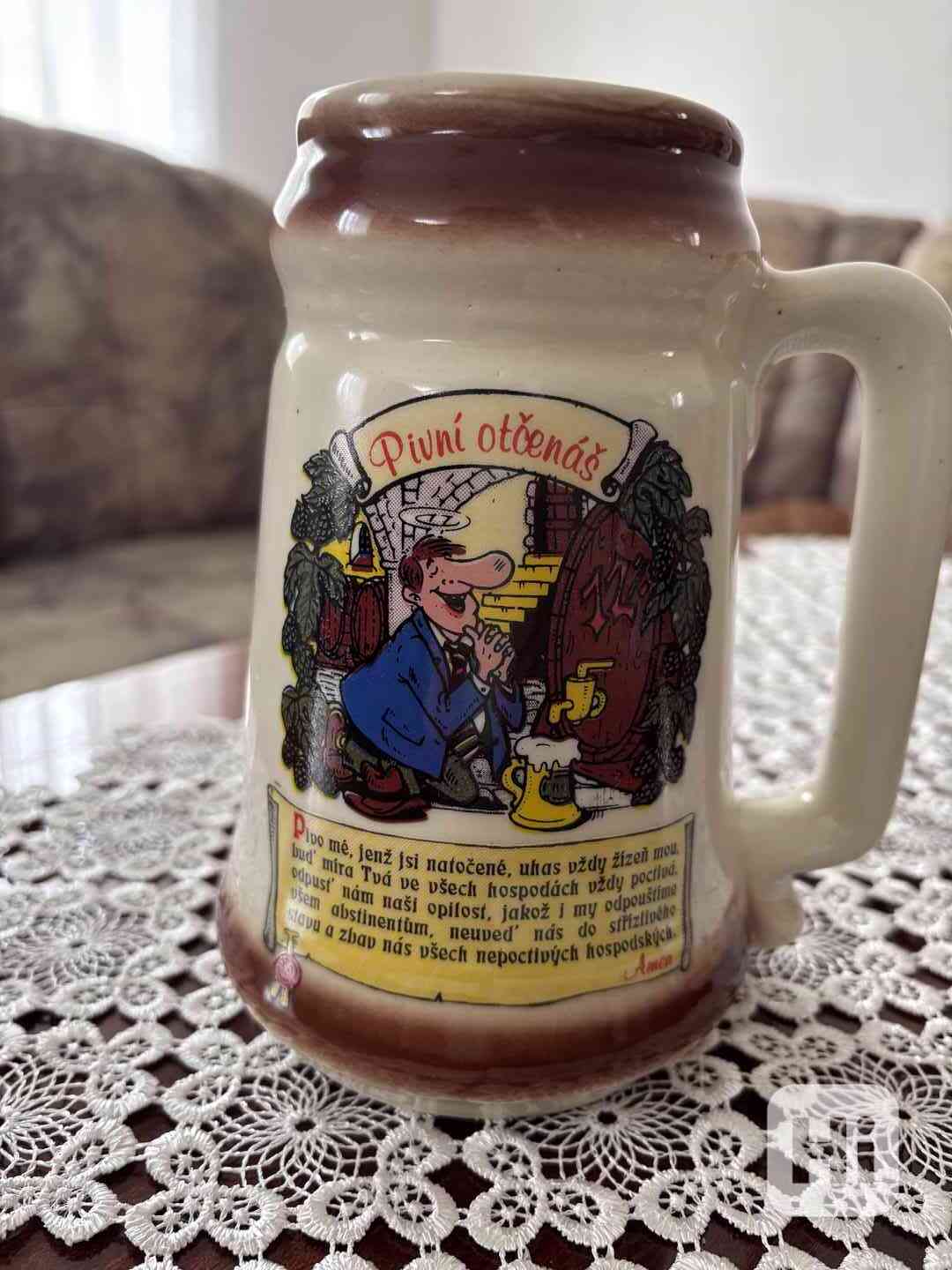 Prodám ,,půllitr" na pivo ,,Pivní otčenáš''. Výška 17 cm, průměr 7,5 cm, objem 0,8 l, cena 250,-Kč, Praha 4, tel: 602605095
