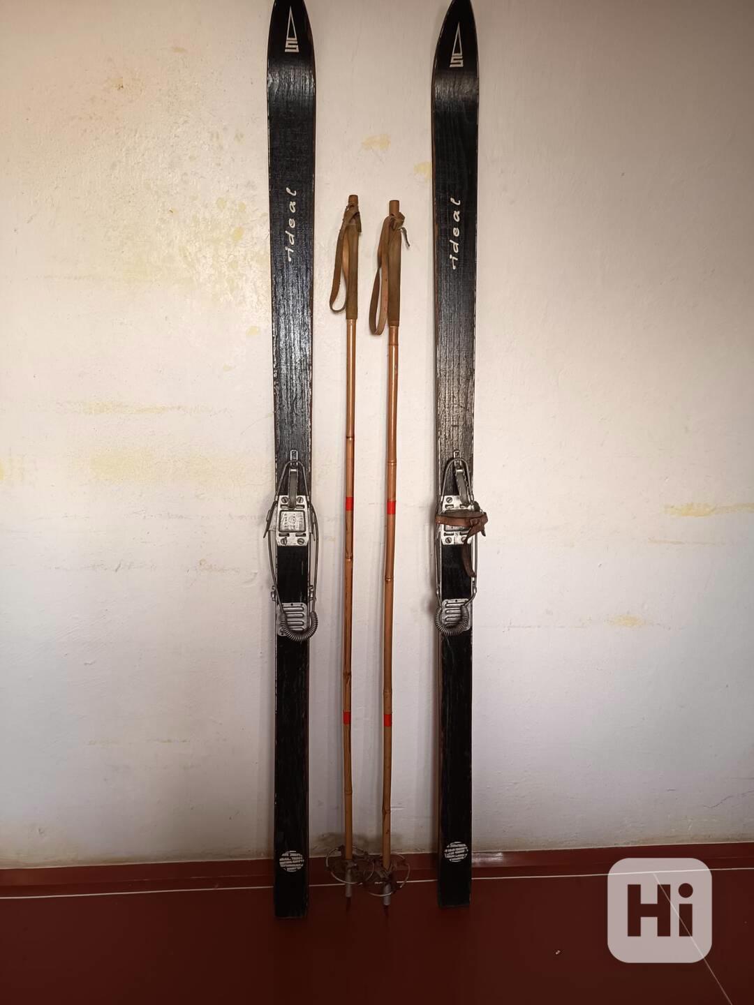 Prodám starožitné dřevěné lyže, délka 160 cm a bambusové hůlky, délka 125 cm